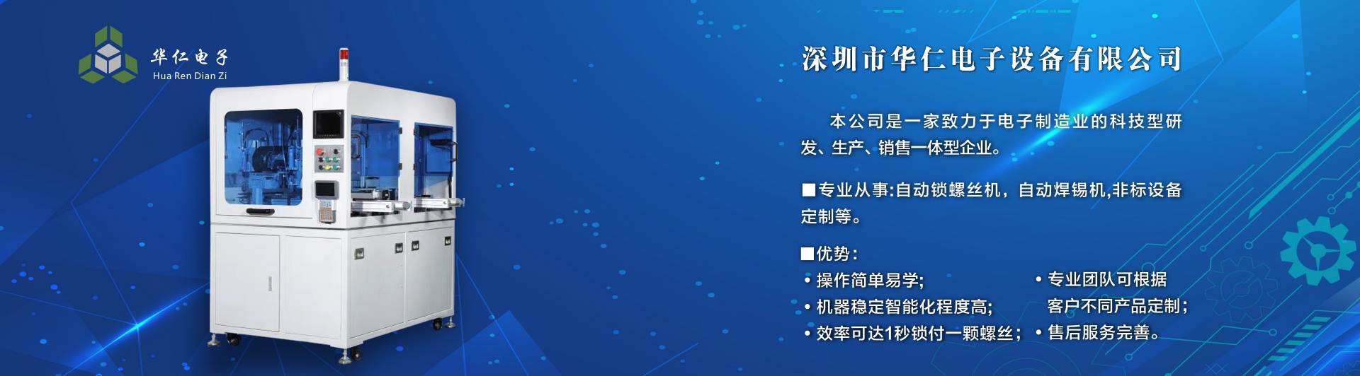深圳市華仁電子設備有限公司是一家致力于電子制造業周邊設備的科技型研發、生產、銷售一體的企業,專業從事:自動鎖螺絲機;自動焊錫機;非標設備定制機等,公司長期以來在行業中積累了豐富的經驗,擁有專業的研發、技術、銷售支持工程團隊、各高級技術人才為客戶提供優質產品和服務,同時不斷吸取國內外先進技術,更準確及時地為客戶提供優質,性價比高的產品、公司以專業的售前、售中、售后服務贏得了客戶的信賴和好評,為客戶提供先進自動化設備一體式解決方案、